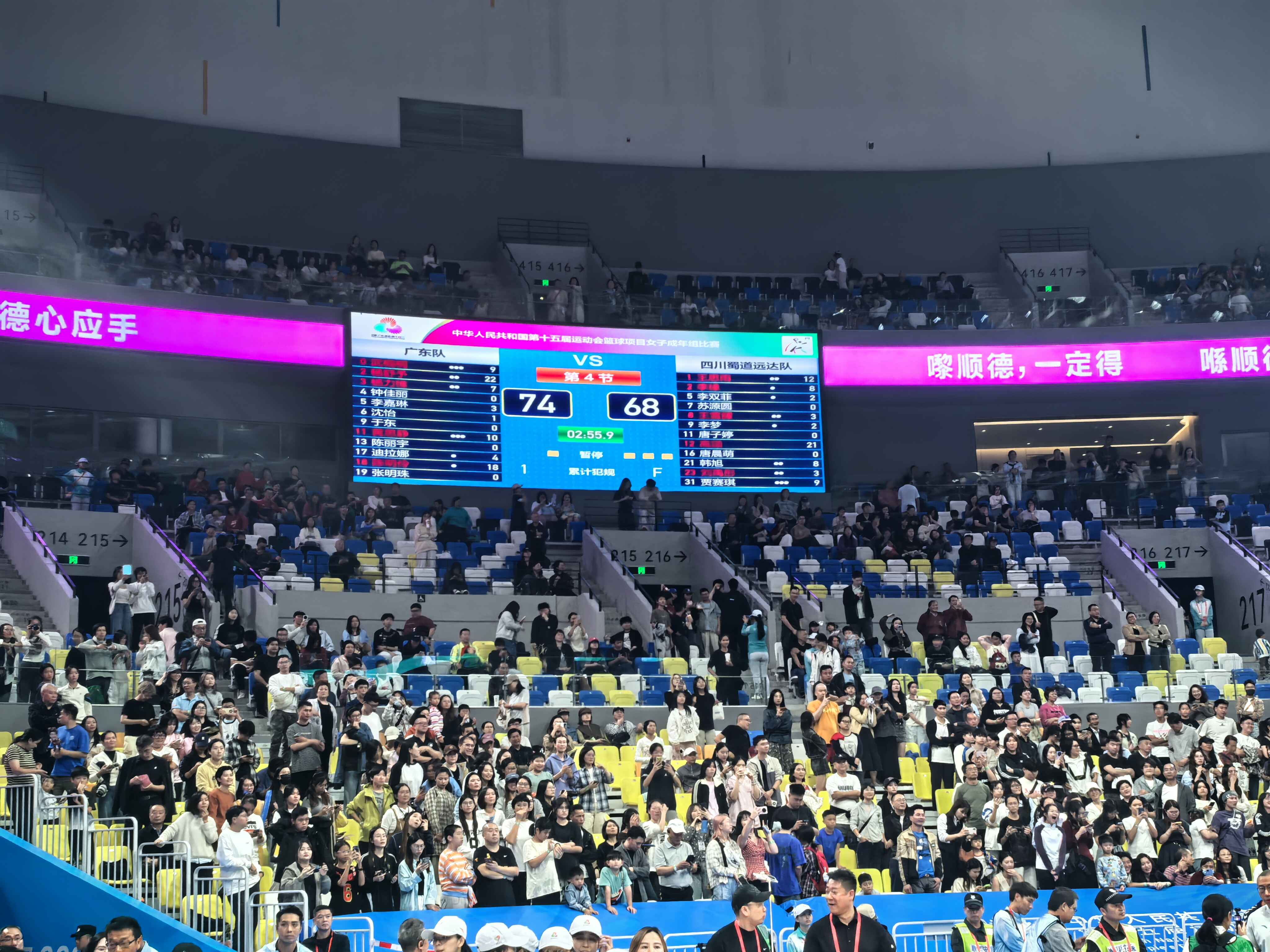 11月15日晚,第十五届全运会女篮成人决赛在佛山市顺德德胜体育中心开赛,东道主广东队对阵四川队。最终,广东队74-68战胜四川队,夺得金牌。广东队在第十五届全运会成人篮球组中夺得两枚金牌。此前,在11月12日晚举行的第十五届全运会成年男篮比赛中,广东男篮以101-65击败浙江男篮,夺得该赛事金牌。南方网广东考察记者 敏慧