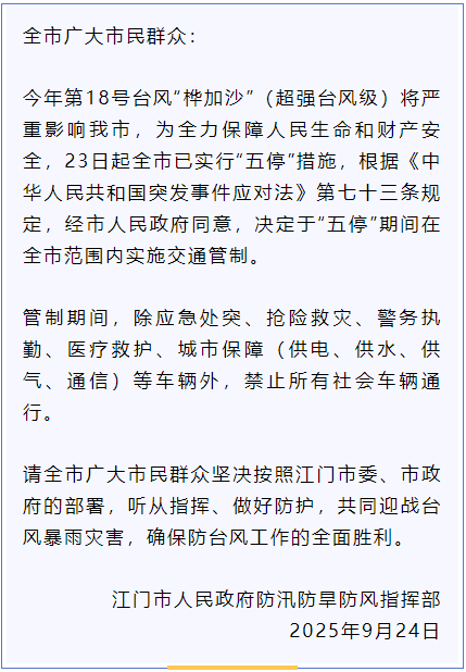 在今天的9:00(TH -24),江门市紧急管理局发布了交通管理通知,指出今年的第18次风暴“ Huagaza”(超级台风)将严重影响江门城。为了充分保护人民的生活和所有者的安全,纽约市实施了从第23日起的“五站”步骤。根据法规,江门市政府命令的“三个防御”决定在“五站”期间实施整个城市的交通管制。除了紧急响应,紧急救援和救灾,警察职责,医疗救援,城市安全(电力供应,供水,供水,天然气供应,通讯)等的车辆外米/秒)和seve登陆后,Rity逐渐减弱。南部网络,广东学习记者朱去了