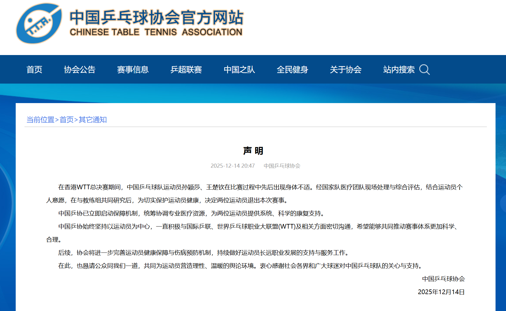 12月14日,中国乒协(下称“中国乒协”)针对国乒选手孙颖哈、王楚钦因身体不适退出世界乒乓球职业联赛(WTT)香港区决赛一事发表声明。中国乒协指出,香港WTT决赛期间,中国乒乓球运动员孙颖哈、王楚钦在比赛过程中出现身体不适。经过国家队医疗队现场处理和综合评估,结合运动员个人喜好,并与教练组共同讨论后,为切实保障运动员健康,决定两名运动员退出本次赛事。中国乒协表示立即建立保障机制,组织专业医疗资源,提供系统科学的康复治疗为两位运动员提供激励支持。未来,协会将进一步完善运动员健康保障机制和伤害预防机制,持续为运动员长期职业发展提供支持和服务。据此前报道,在12月13日举行的2025年世界乒乓球职业联赛(WTT)香港区总决赛女单半决赛中,国乒选手孙英哈在面对队友蒯曼时,因脚踝不适选择退赛。当日举行的混双决赛中,孙颖哈带伤出战。最终王楚钦/孙颖莎0-3不敌韩国组合林仲勋/申玉比南获得亚军。 12月14日,男单半决赛,王楚钦对阵莫加德。赛前,王楚钦因伤宣布退役。