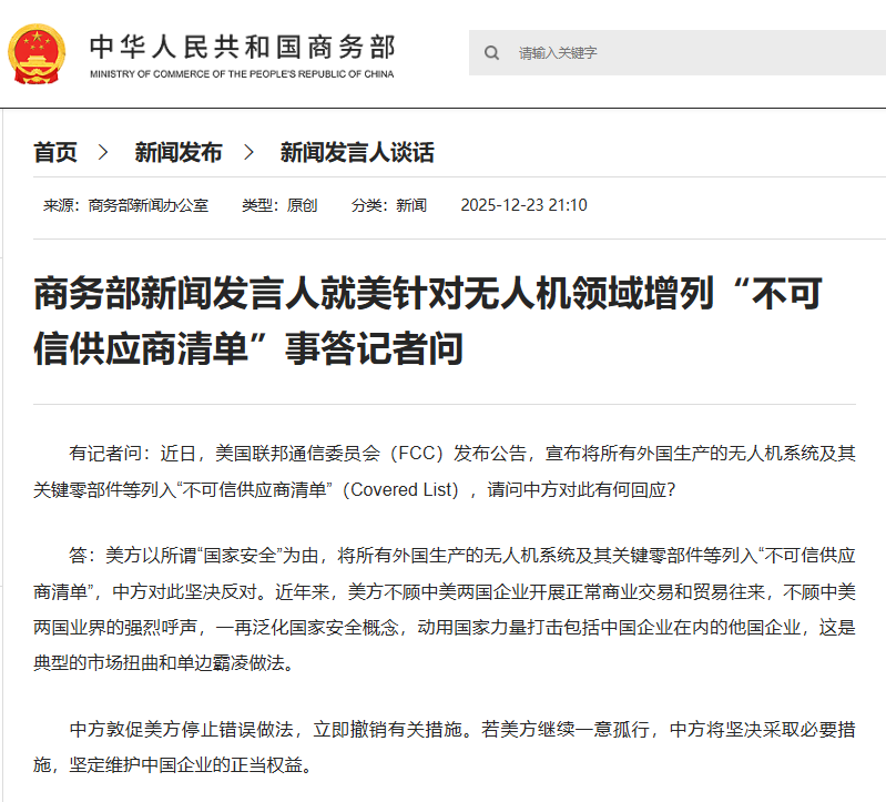 有记者问:近日,美国联邦通信委员会(FCC)发布公告,宣布将所有外国无人机系统及其主要部件纳入“涵盖清单”(Covered List)。中方对此有何回应?答:美国以所谓“国家安全”为由,将所有外国制造的无人机系统及其关键零部件列入“不可信供应商名单”。中方对此表示强烈反对。近年来,美方无视中美企业之间正常的商业交易和贸易往来,无视中美两国业界的强烈呼声。它多次泛化国家安全概念,利用国家力量攻击包括中国在内的其他国家的企业。这是典型的市场扭曲和单边霸凌行径。中方敦促美方停止错误做法,立即撤销有关措施。如果美国继续中方坚持走自己的路,将坚决采取必要措施,严格维护中国企业的合法权益。